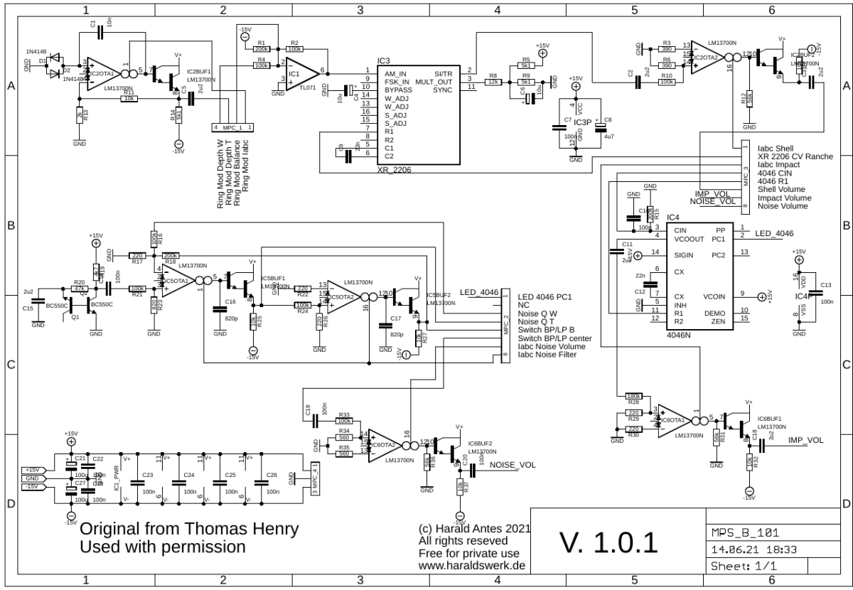You can find detailed descriptions of Thomas Henry's Mega Percussion Synthesizer on the net. My changes are adding input buffers to all four sections off the MPS to make the adjustment of the potentiometers independent from each other. This is done with IC1 on the control board. And the mixing off the CV input with noise/impact. This is done with IC2C/D on the control board.