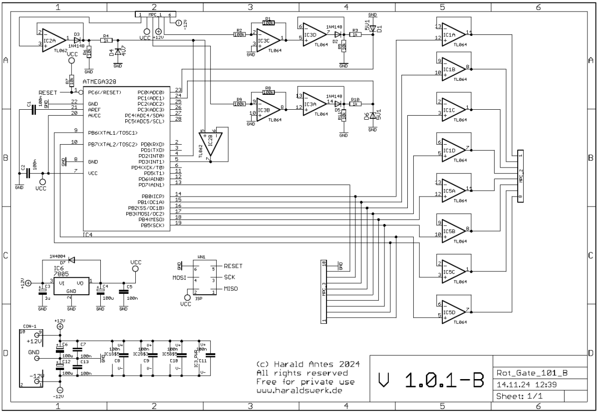 Nothing special to mention. On page one you see the input CV adders and the outs with LED. On page two are the input protection circuitry and the micro as well as the output buffers.