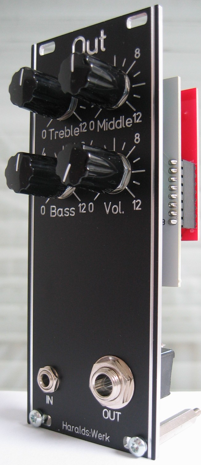 This is the Euro version of my replacement of the original Elektor Formant COM module which I used in the NGF project. I discarded the original circuitry because of the TL085 used there with his unusual pinout and the availability of dedicated audio operational amplifiers. I used a more effective filter implementation for tone control. The tone control is derived from "Small Signal Audio Design" by Douglas Self Chapter 15. The maximum output volume is adjustable to protect your PA. You can connect the output directly to active monitors. That's what I am using them for.