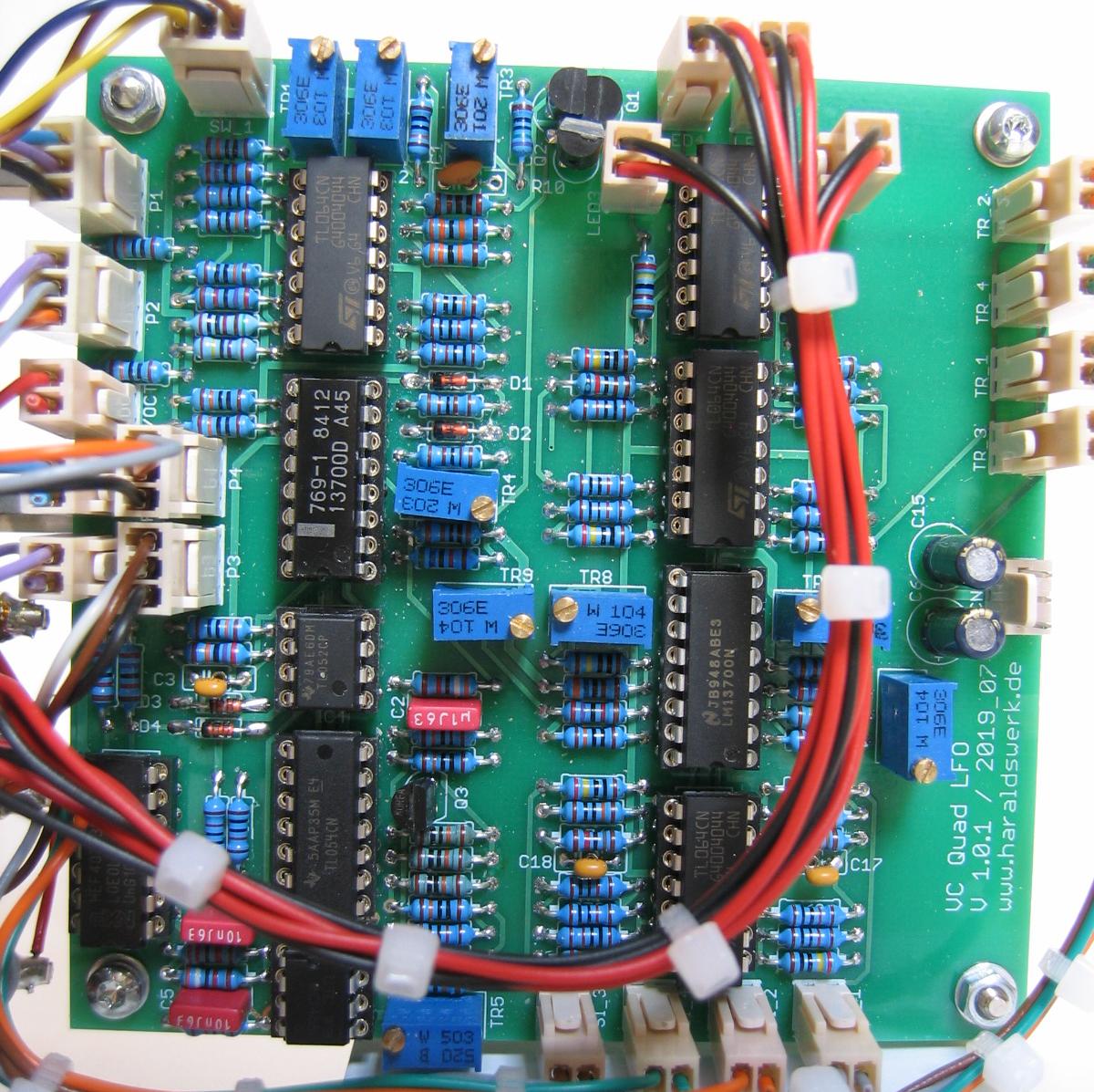 I want to rotate sound through four channels of my modular synthesizer. Or move successive through different CV or audio sources. This is easily achieved with a quadrature LFO and four VCA. The core of this voltage controlled quadrature LFO was published in Electronotes EN#122 pg13ff 1981 and designed by Thomas Henry. I took the core and added the voltage control and the sine shapers.